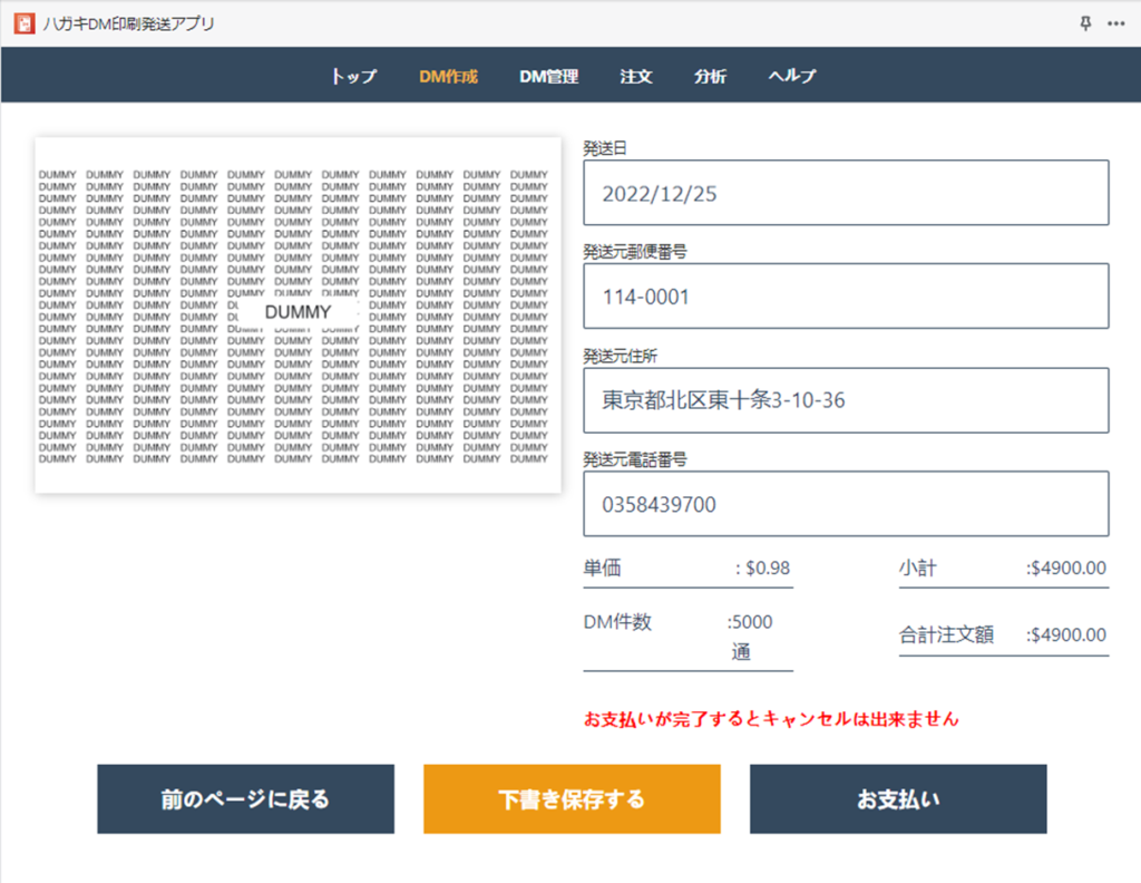 送り元の情報を入力したら、あとは内容を確認して発注を確定するだけです。送り元の情報を入力する画面から「入力とお見積りの確認」を押下すると、注文内容の確認画面に遷移します。表示されている内容に問題がないようでしたら、「お支払い」を押下して下さい。※この段階では決済されません。