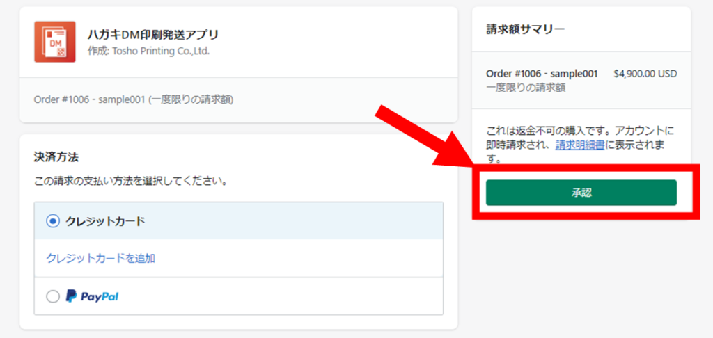 ・shopifyの「請求を承認する」画面にページ遷移しますので、決済方法の選択と、請求額サマリーから金額の確認を行い、承認ボタンを押下して下さい。