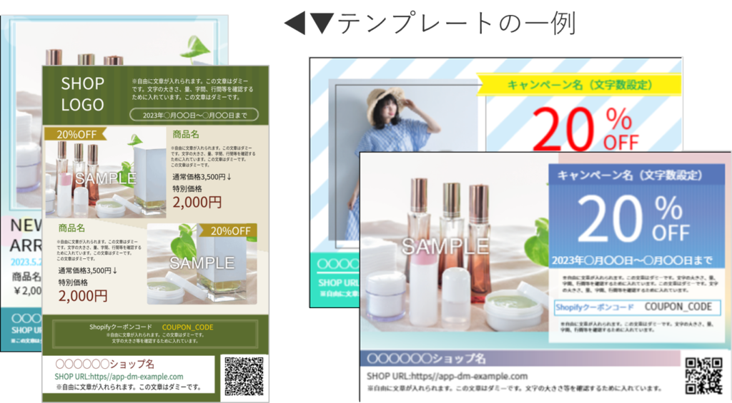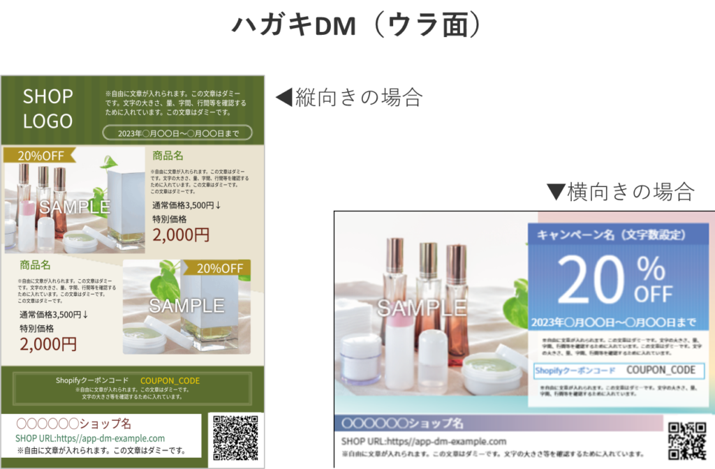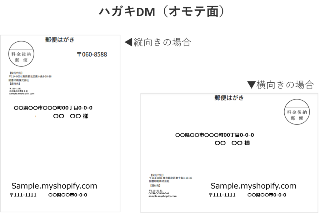 本アプリでは、上記のようなハガキDMを簡単に作成できます。オモテ面は、本アプリが顧客情報を基に自動で作成します。裏面は、PDFのインポートまたはテンプレートで作成します。