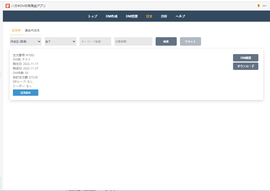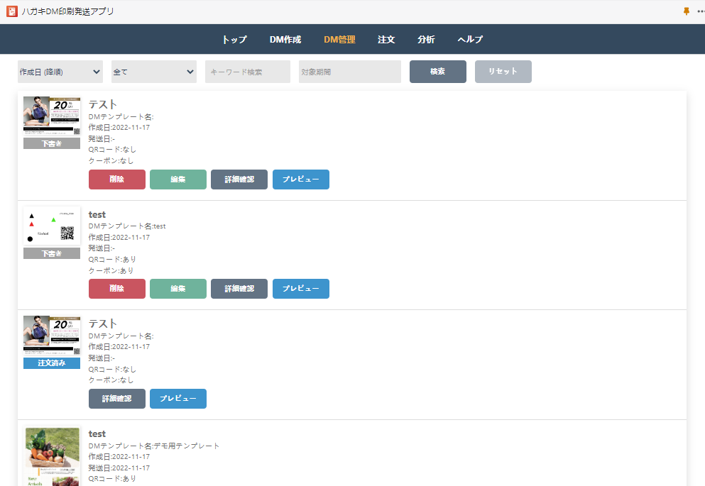 「DM管理」タブをクリックする事で移動できます。注文済みのハガキDM、または作成中に一時保存したハガキDMを確認する事ができます。