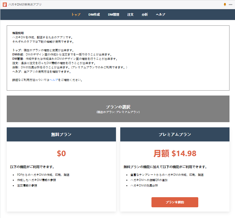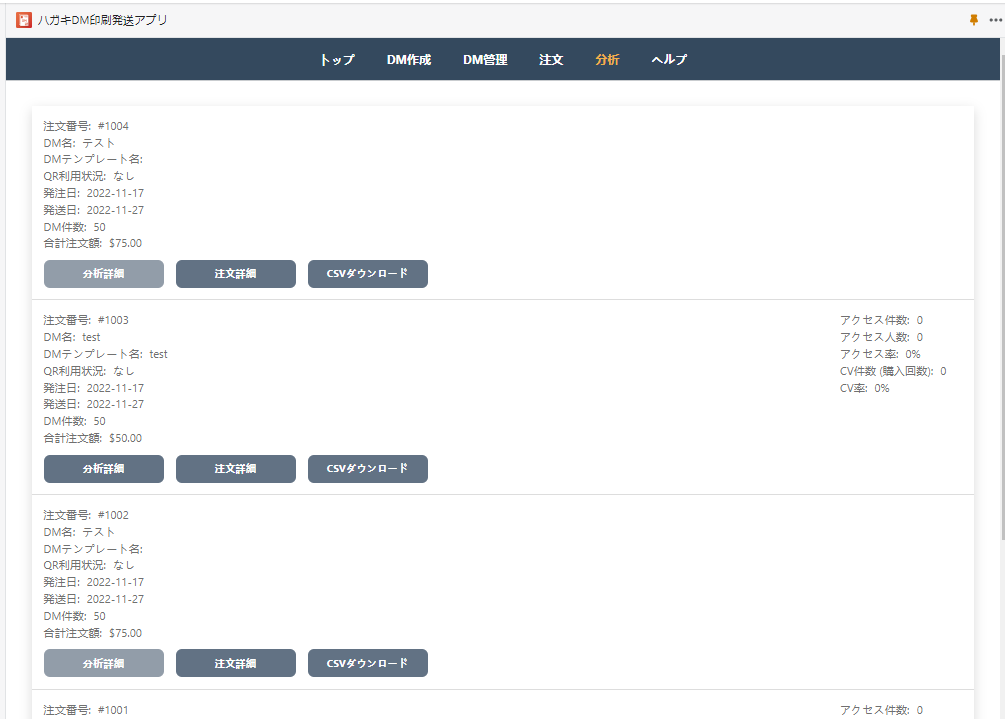本アプリは主に「トップ」「DM作成」「DM管理」「注文」「分析」の画面が存在します。