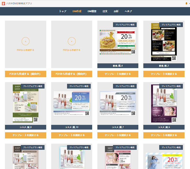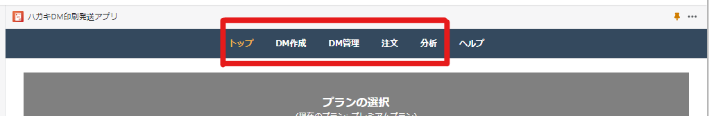 「DM作成」タブをクリックする事で移動できます。ハガキDMの作成を始めるための画面です。ハガキDMをご注文いただく場合は、本画面から行います。