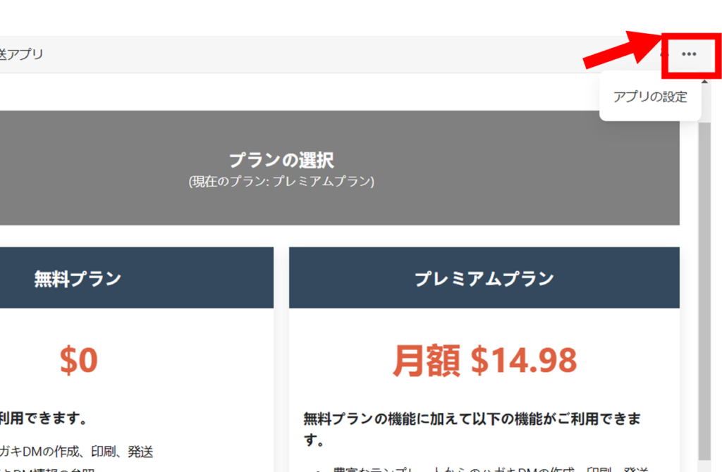 1) アプリ画面右上の「…」を押下すると「アプリの設定」というポップアップが表示されます。ポップアップを押下して下さい。