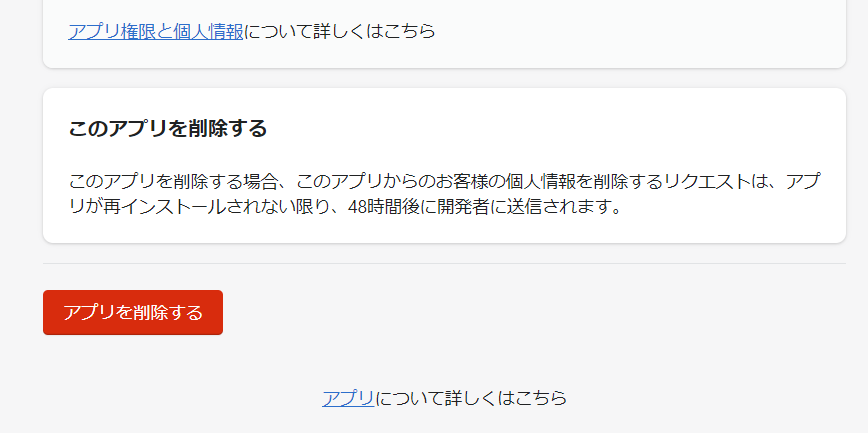 2) shopifyの設定画面が表示されたら、画面を下にスクロールして下さい。「アプリを削除する」というボタンが存在しますので、ボタン押下して下さい。